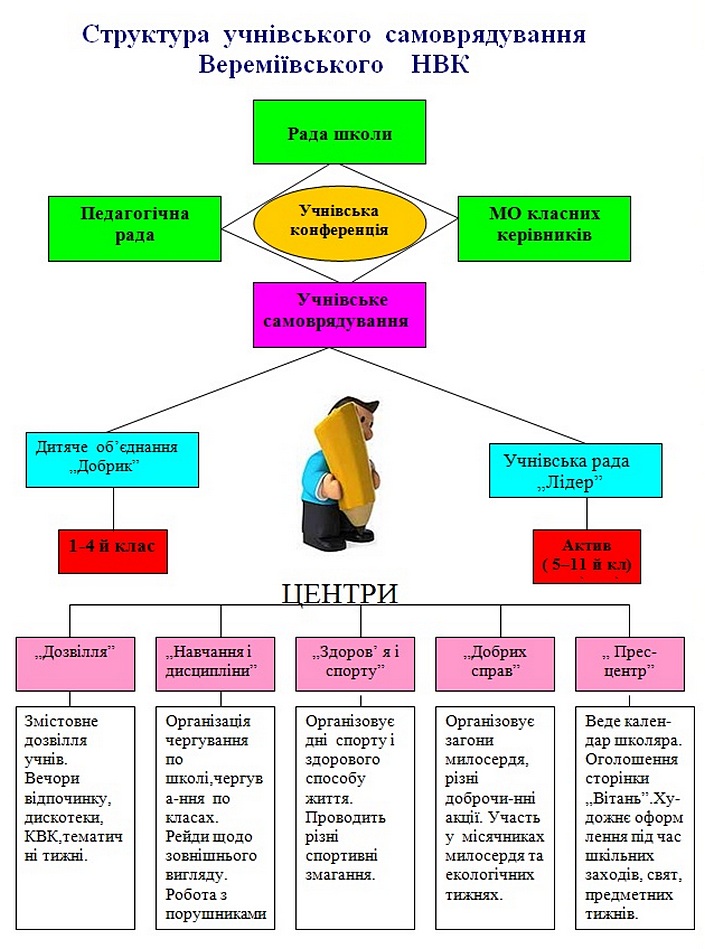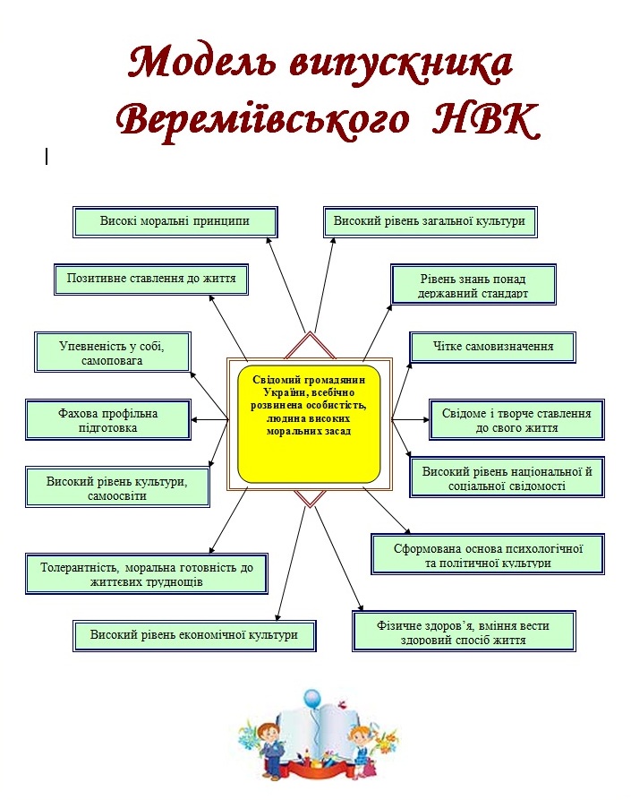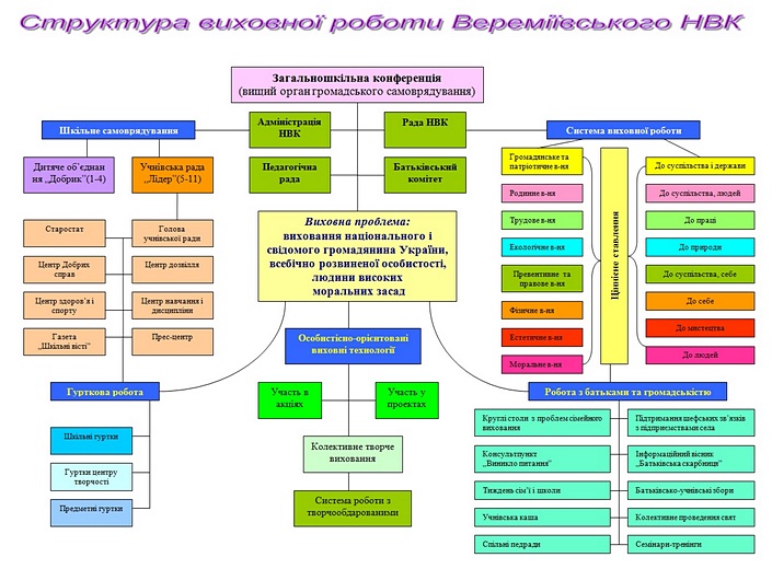 Софія Русова Серед найголовніших проблем в усі часи і для всіх народів завжди була і залишається проблема виховання. Будь-яка дитина має золоте зерно душі, яке, потрапляючи на родючий грунт виховання, дає світлолюбні пагінці добра, правди, гідності, гордості, тощо. Кожен учень має і повинен бути у чомусь першим: один – у навчанні, другий – у трудовій діяльності, третій – у мистецтві, четвертий – у спорті. Необхідність кожній школі, НВК мати власну виховну систему сприймається сьогодні як актуальна науково-практична проблема. В Державній національній програмі «Освіта» її створення розглядається як один із «основних шляхів реформування виховання». Виховна система школи повинна бути ядром загальношкільного механізму цілеспрямованого формування соціального досвіду вихованців і враховувати: по-перше, соціальне замовлення, оформлене на рівні різноманітних надособистісних соціальних систем — людських спільностей; по-друге, досягнутий рівень сформованості у вихованців окремих соціальних якостей і соціального досвіду в цілому; по-третє, особливості конкретного НВК: умови, традиції, якісний склад педагогічного колективу, матеріальну базу тощо. Тобто виховна система школи повинна бути конкретним механізмом дії конкретних фахівців. Виховна система Вереміївського НВК базується на меті і завданні, змісті, формі та методах виховання, діагностиці результатів виховної роботи. Таким чином робота навчального закладу спрямована на реалізацію стратегічних державних завдань реформування змісту освіти, зокрема, на «створення умов для розвитку й самореалізації кожної особистості як громадянина України, формування покоління, здатного навчатися впродовж життя, створювати й розвивати цінності громадянського суспільства» (Національна доктрина розвитку освіти). Школа не повинна готувати дитину до життя, а вчити жити, оволодівати практичними навичками життєтворчості, здійснюючи дію самореалізації у різних видах навчальної, ігрової, практичної діяльності. У самостійне життя має вийти особистість, яка здатна брати відповідальність за прийняті рішення на себе, критично мислити і використовувати набуті знання і вміння для творчого розв’язування проблем, змінювати на краще своє життя і життя своєї країни. Самореалізація як необхідна умова виховання компетентного випускника школи, успішного громадянина України передбачає здійснення можливостей розвитку Я власними зусиллями, шляхом співдіяльності, співтворчості з іншими людьми, соціумом і світом у цілому. „Від культури особистості - до культури нації” Важливість та актуальність становлення виховної системи нашого НВК зумовлені тим, що нині спостерігаємо значну моральну деrрадація суспільства, зростає кількість неблагополучних, неповних сімей; дітей-правопорушників; молодь часом не достатньо підготовлена до дорослого самостійного життя, не має чітких моральних і духовних орієнтирів. У процесі становлення виховної системи ми виходили з гіпотези, що під час всебічного розвитку життєво-компетентної особистості провідна роль належить національно-патріотичному вихованню. Національно-патріотичне виховання є складовою загального виховного процесу підростаючого покоління, головною метою якого є набуття молодими громадянами 14-35 річного віку соціального досвіду, готовності 